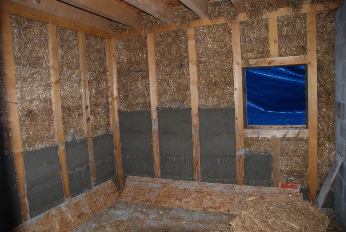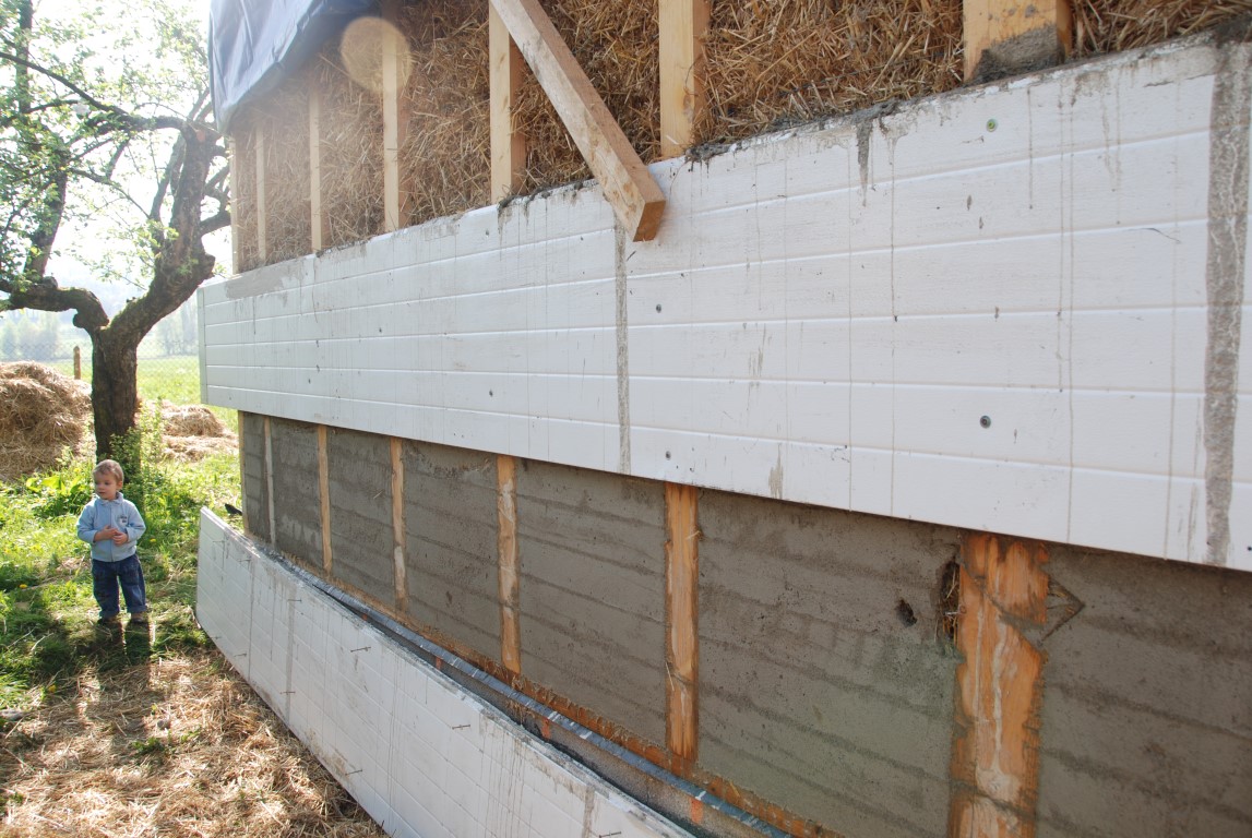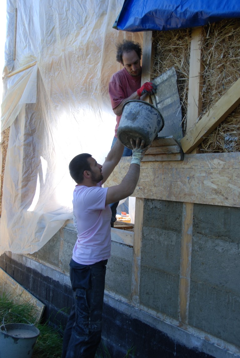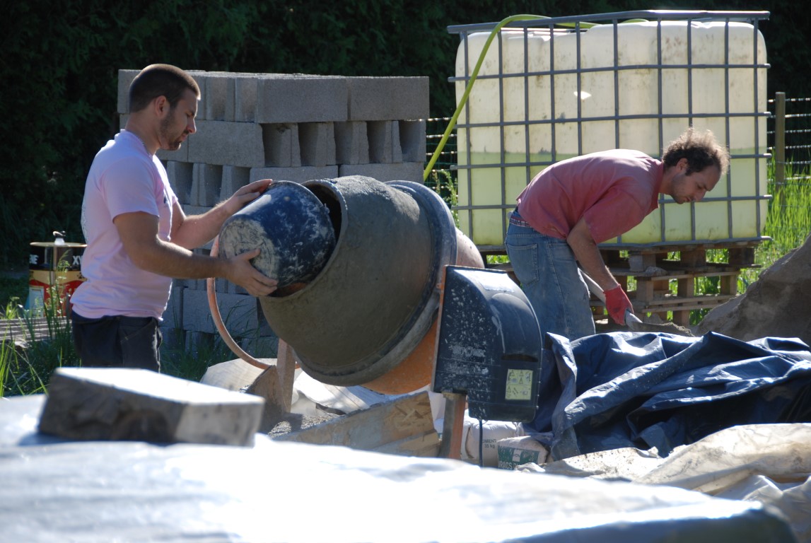 Après la livraison de 10 m3 de sciure de bois le 4 Avril, nous nous sommes attaqué au mortier. Avec le mélange suivant: 3 volumes de sciure, 3 volumes de sable, un de chaux et un de ciment. Ce mélange se coule entre la paille et une planche de coffrage. Merci aux parents de Micka, à David et à la famille Roussard.