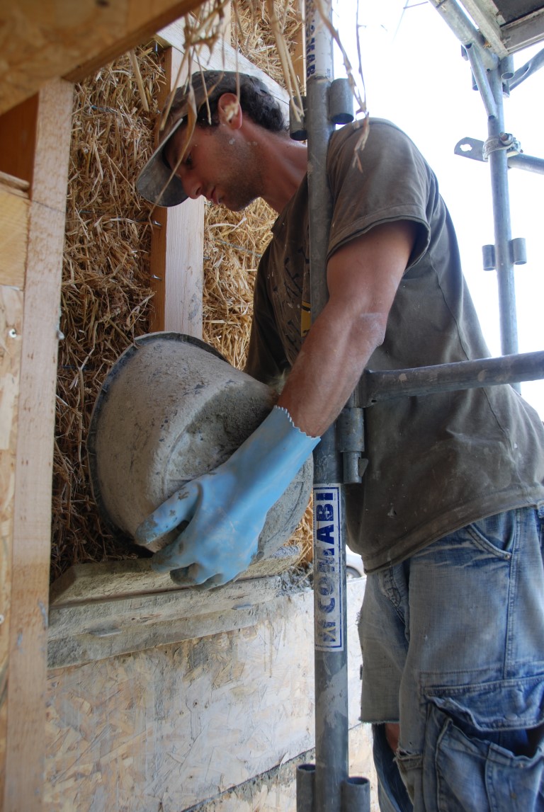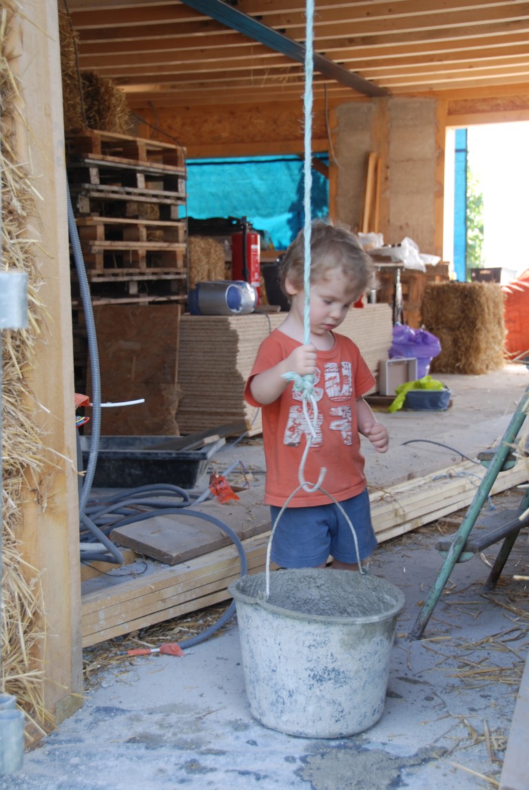 Eliel aide à accrocher des sceaux;et Micka se fait les muscles en coulant le mortier.