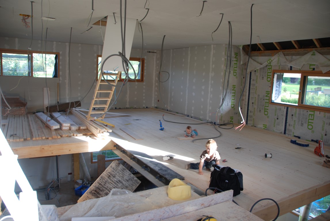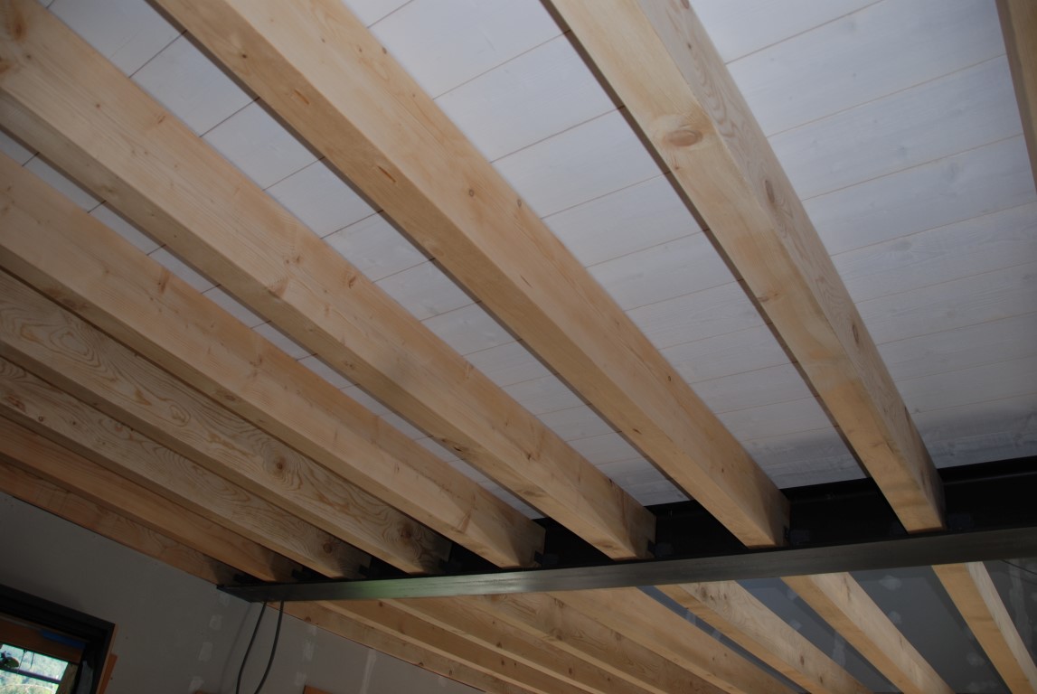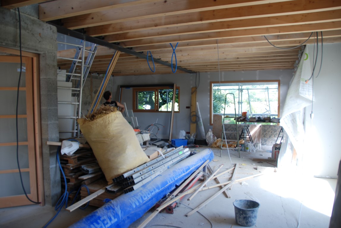 Une porte d’intérieur pour fermer le bureau où l’on a reçu des amis. On a aussi posé le lambris au-dessus des solives. Ce que vous voyez là, c’est donc le plafond du RDC dans sa version finale.